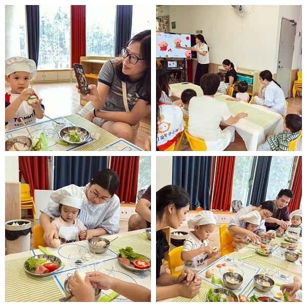 现场氛围温馨而充满趣味。在音乐律动环节,宝宝们跟随节奏拍手、跺脚,初步感知音乐的韵律与身体的协调;绘本阅读时间,亲子辅导员以生动语言将《汉堡男孩》的故事娓娓道来,家长与孩子们沉浸其中,共情于角色的冒险与成长。感统运动区则设置了“我是小厨师”亲子互动任务——制作鸡蛋汉堡,孩子们在动手过程中不仅锻炼了手部精细动作,也在协作中增进了亲子情感联结。