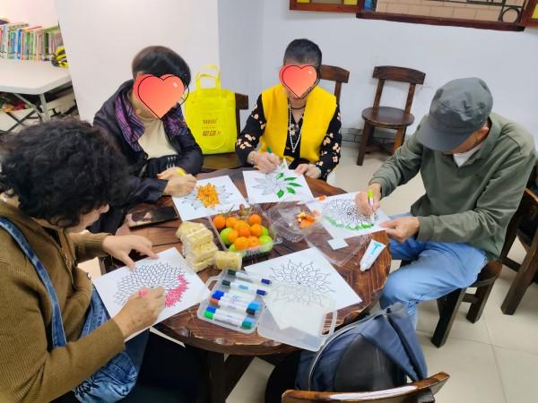 随后的绘画环节以一段舒缓的正念冥想开启。在轻柔的音乐与引导语中,长者们渐渐放松身心、静享当下。冥想结束后,大家专心投入曼陀罗绘画创作,志愿者从旁细心协助。笔尖流转之间,时光宁静而治愈,长者们也在色彩中舒展了心情。